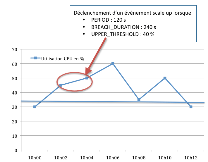 • Les événements lancés selon des critères d’augmentation et de diminution d’un groupe de Machines Virtuelles – aussi appelés triggers portent sur tous les éléments qui peuvent être agrégés par le service de monitoring CloudWatch pour des statistiques : CPU, réseau, disques… La définition d’un trigger passe notamment par les paramètres suivants : period, breachDuration, valeur du seuil bas et valeur du seuil haut de la statistique. La période exprime l’intervalle de temps entre deux évaluations de la statistique faites par CloudWatch. Le paramètre BreachDuration indique le temps pendant lequel la statistique doit dépasser la valeur limite haute ou basse, avant que l’événement ne soit lancé.