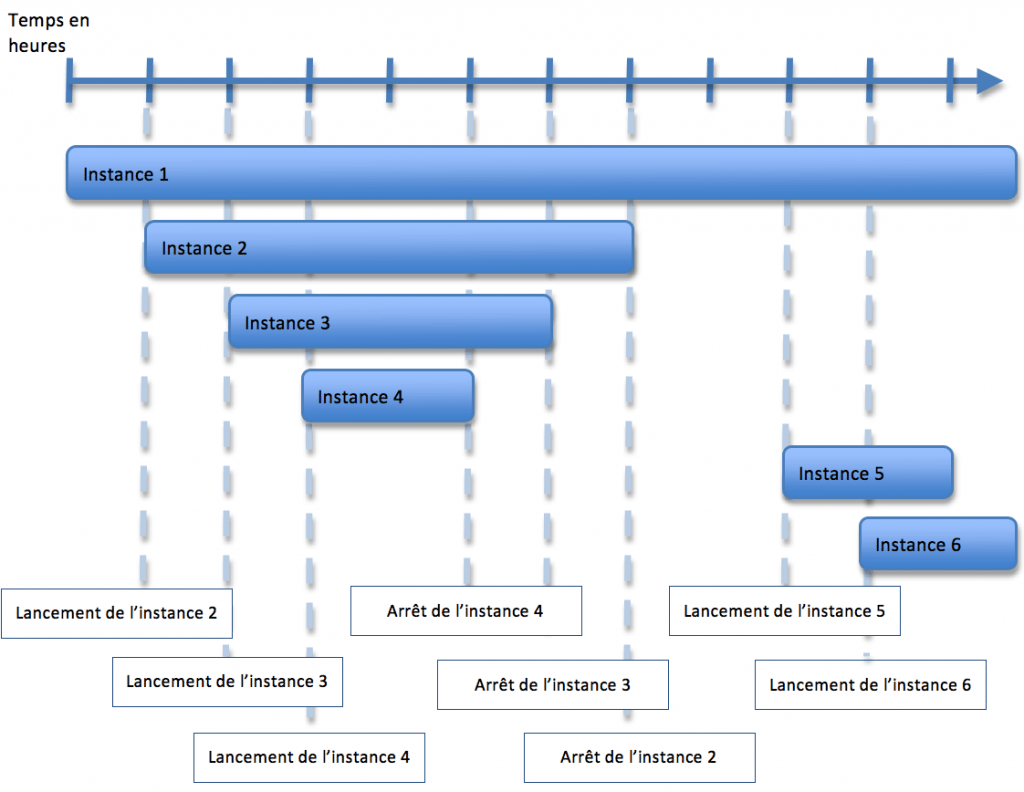 Supposons maintenant que l’échelle de temps du graphique précédent ne soit pas l’heure, mais la minute. Nous avons alors 6 heures machines à payer – car chaque heure consommée est pleinement facturée – pour seulement 12 minutes de fonctionnement. Notons au passage que 4 instances auraient suffi. Cet exemple s'applique sur quelques minutes et quelques machines, imaginons maintenant que cela concerne des dizaines de machines pendant une année...
