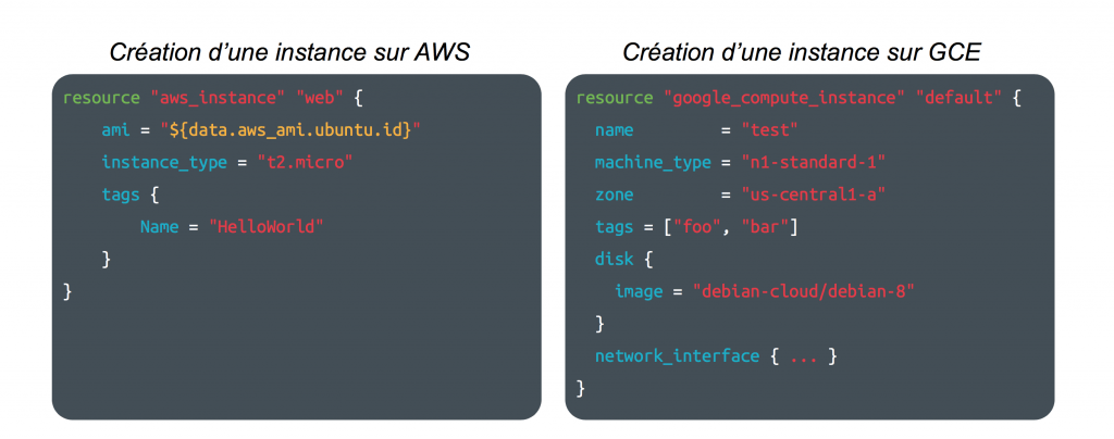 L'une des forces de Terraform est de centraliser tous ces providers dans un outil unique, et surtout, d'en décrire leur configuration seulement. Cela limite l'aspect "plomberie" d'un script bash qui pourrait remplir le même usage. Le descripteur de ressources utilise le Hashicorp Configuration Language, permettant de profiter des spécificités de chaque provider, même s'ils proposent le même type de service. L'idée ici n'est pas d'offrir une abstraction unique, mais bien une meilleure manière de faire.