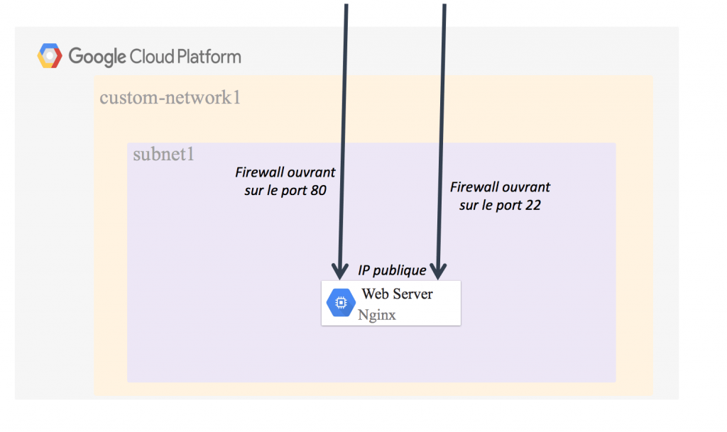 Pour illustrer Terraform, nous allons déployer une application simple : un serveur web derrière un firewall. La plateforme cloud sur laquelle nous allons provisionner (= le provider) notre application sera Google Cloud Platform.