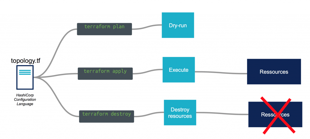 Terraform utilise le pattern "ressource" et se soucie de l'idempotence : on décrit l'état cible souhaité, il génère un graphe entre le code et l'état de l'infrastructure. Si aucun delta n'est détecté, il n'appliquera rien. Si la ressource n'existe pas, elle sera créée. Si une configuration est incorrecte, elle sera modifiée pour aller dans le sens du fichier descripteur.