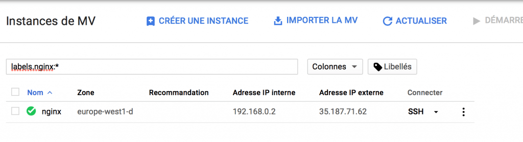 L'image source est la "debian-cloud/debian-8". On attribue le tag "nginx" à l'instance pour que les firewalls donnent accès sur les ports ssh et http.