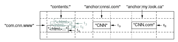 Une première dimension correspond à la ligne. Cette ligne est identifiée dans notre exemple par la clé com.cnn.www et l’ensemble des clés est trié par ordre lexicographique. Ainsi, le contenu associé aux clés les plus proches (ex. com.cnn.topics et com.cnn.www dans notre exemple) est regroupé. Les lignes sont ensuite regroupées en « tablets » qui sont une unité de répartition. La seconde dimension qui correspond aux colonnes (qui peuvent être regroupées en famille de colonnes) représente un autre axe de lecture (également indexé). Par exemple, le ou les langages dans lesquels la page a été écrite, les pages référençant l’élément courant (l’élément « anchor » dans notre exemple).
