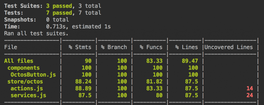 Le coverage est assez facile à mettre en place également : il suffit de lancer jest avec le bon paramètre soit en ajoutant un nouveau script dans le fichier package.json ("test_with_coverage": "jest --coverage") soit en modifiant la configuration de Jest dans ce même fichier en ajoutant ("collectCoverage": true) et c’est gagné.