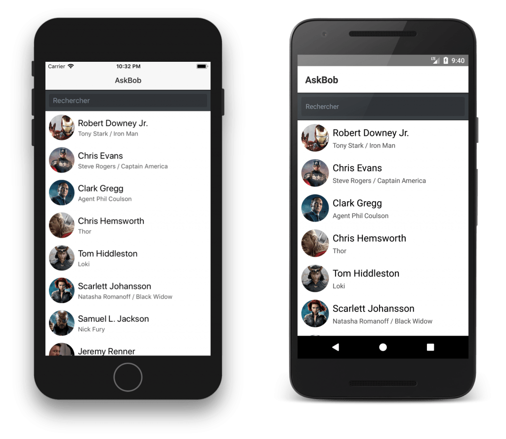 Nous avons choisi de réaliser notre test en développant avec React Native une application annuaire qui contient deux écrans. Le premier écran liste les employés d’une entreprise et permet de les filtrer. Le deuxième affiche le détail d’un employé et ses coordonnées pour pouvoir le contacter. Nous avions déjà développé cette application en interne en natif (en Swift pour iOS et en Kotlin pour Android) dont voici l’écran de liste :