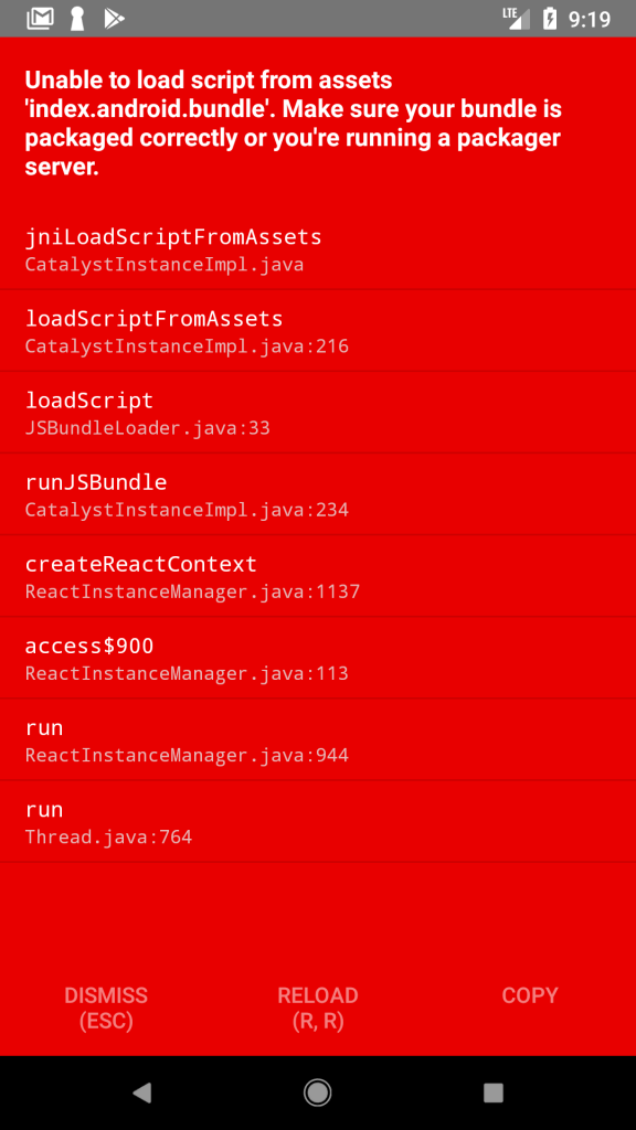 Bon ce n’est pas si grave, on a réussi à contourner ce problème en créant deux classes et en les faisant hériter des classes Kotlin. Ensuite, on continue à suivre la documentation, et puis on lance react-native run-android et let’s go. Eh bien non ! On a eu droit à notre écran rouge préféré :