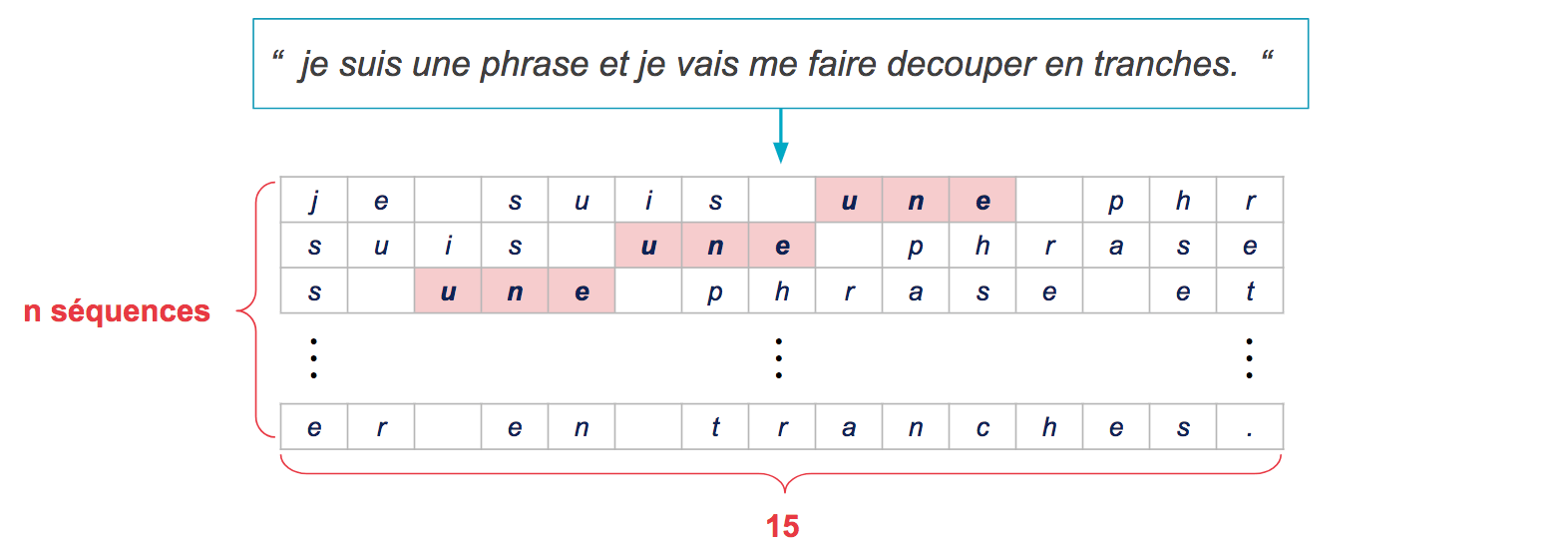 À l’extrême, un pas de 1 génère toutes les séquences possibles. Cela augmentera le temps d’entraînement, mais sans forcément améliorer les performances. En effet, 2 séquences consécutives n’auront que 2 caractères différents, et le réseau verra beaucoup d’exemples redondants. Pour notre modèle nous avons choisi un pas de 3 comme représenté sur la figure.