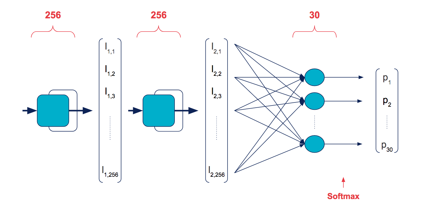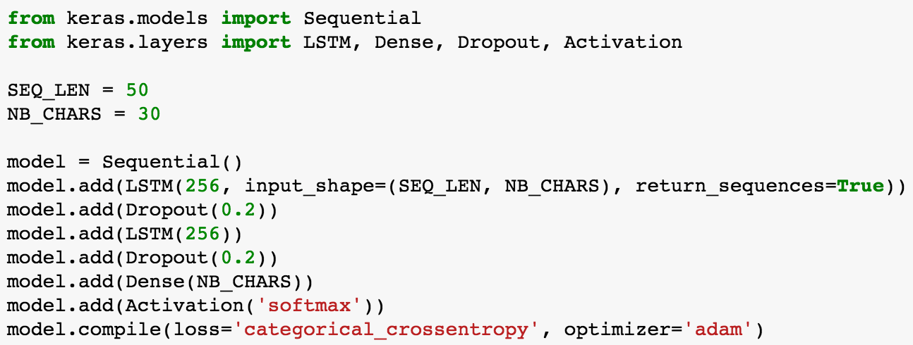 Le modèle que nous avons utilisé est un réseau récurrent formé d’une succession de deux couches RNN et d’une couche MLP. La succession de plusieurs couches de RNN augmente la “profondeur” du réseau, et permet d’extraire des relations d’autant plus complexes (moins linéaires) entre les entrées. On utilise ici un type particulier de RNN, les Long Short-Term Memory (LSTM), sur lesquels nous reviendrons en détails dans un prochain article. La dernière couche MLP est de taille 30, de façon à ce que chaque neurone corresponde à un caractère à prédire. On normalise la prédiction via une fonction softmax pour obtenir une distribution de probabilité.