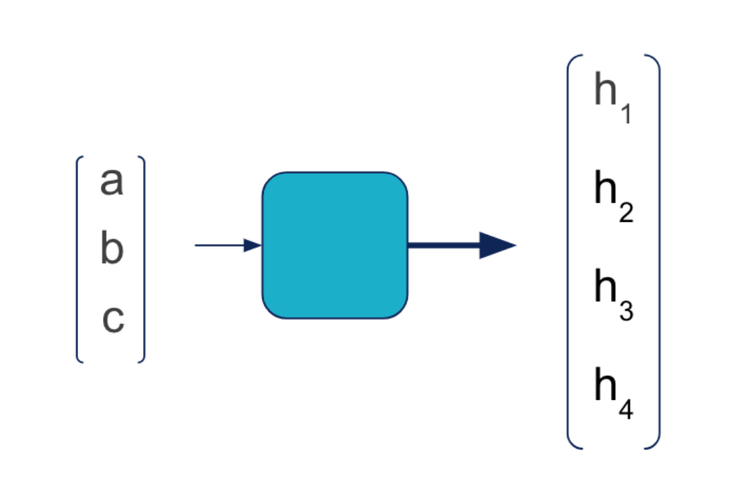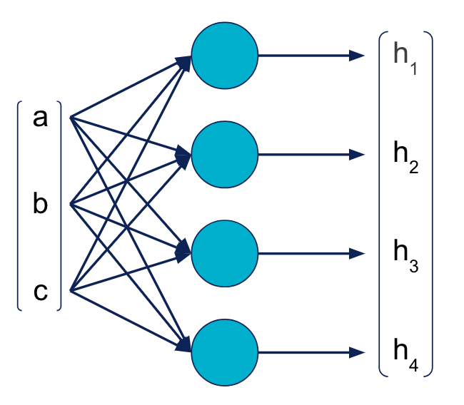 Dans le schéma suivant, une couche de MLP reçoit en entrée un vecteur [a, b, c], et produit en sortie un vecteur [h**1, h2, h3,** h**4****]**.