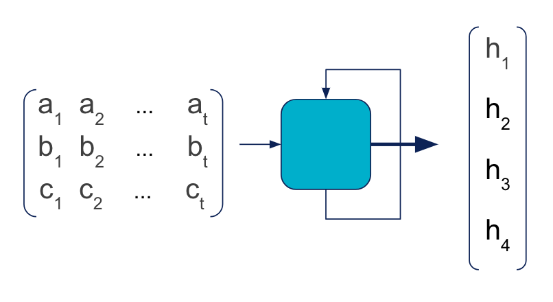 Une façon naïve de procéder serait de mettre à plat l’ensemble des valeurs dans un unique vecteur (a**1, …, an,** b1, …, b**n,** c1, …, c**n****)**, et de les fournir en entrée de la première couche d'un MLP. Cependant les MLP ne font aucune distinction dans l’ordre des valeurs d’une couche. Cette méthode équivaut ainsi à mélanger toutes les valeurs : la dynamique temporelle serait annihilée, la relation entre les valeurs successives prises par a, b et c serait perdue. De plus le nombre de paramètres à apprendre sur la première couche augmenterait proportionnellement avec la longueur des séquences. En bref, la performance ne serait pas au rendez-vous.