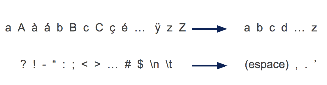Notre donnée textuelle brute contient 195 caractères différents : majuscules, minuscules, accents, caractères spéciaux en tous genres… Nous commençons par nettoyer le texte, pour se ramener à des mots en lettres minuscules, séparés par des espaces, des apostrophes, des points ou des virgules.