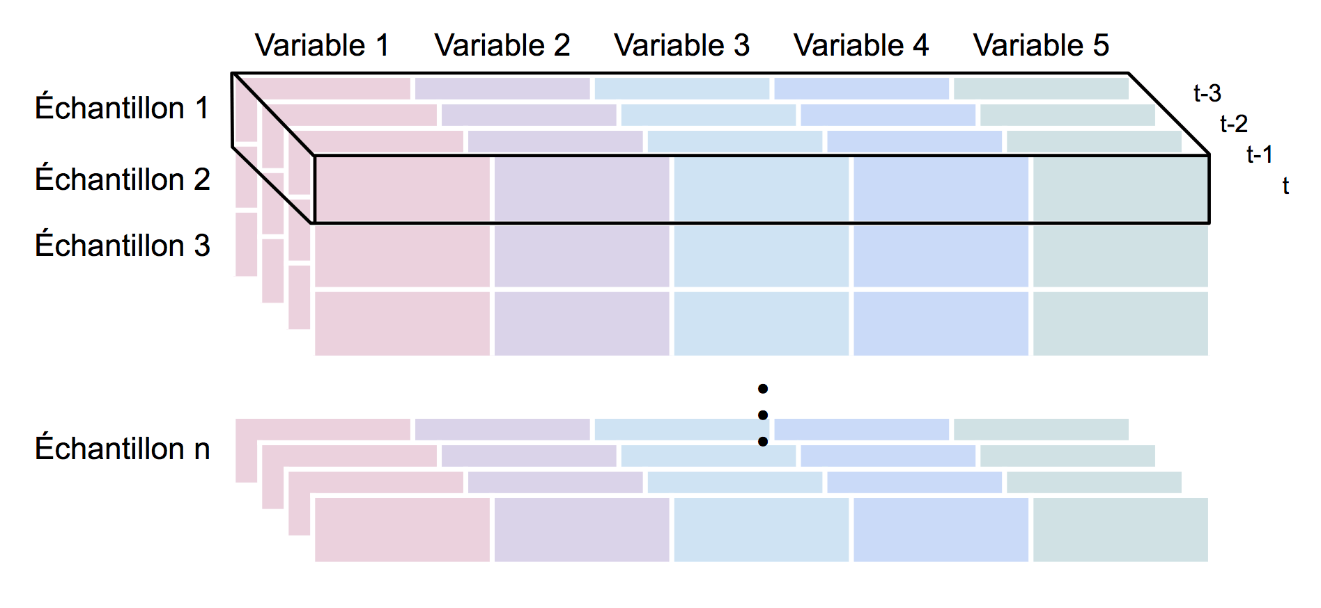 En plus de ces deux dimensions, un réseau de neurones récurrent attend en entrée une troisième dimension qui est la dimension temporelle. Nos données d'entrée doivent donc avoir les dimensions (nombre d’échantillons, longueur des séquences, nombre de variables).