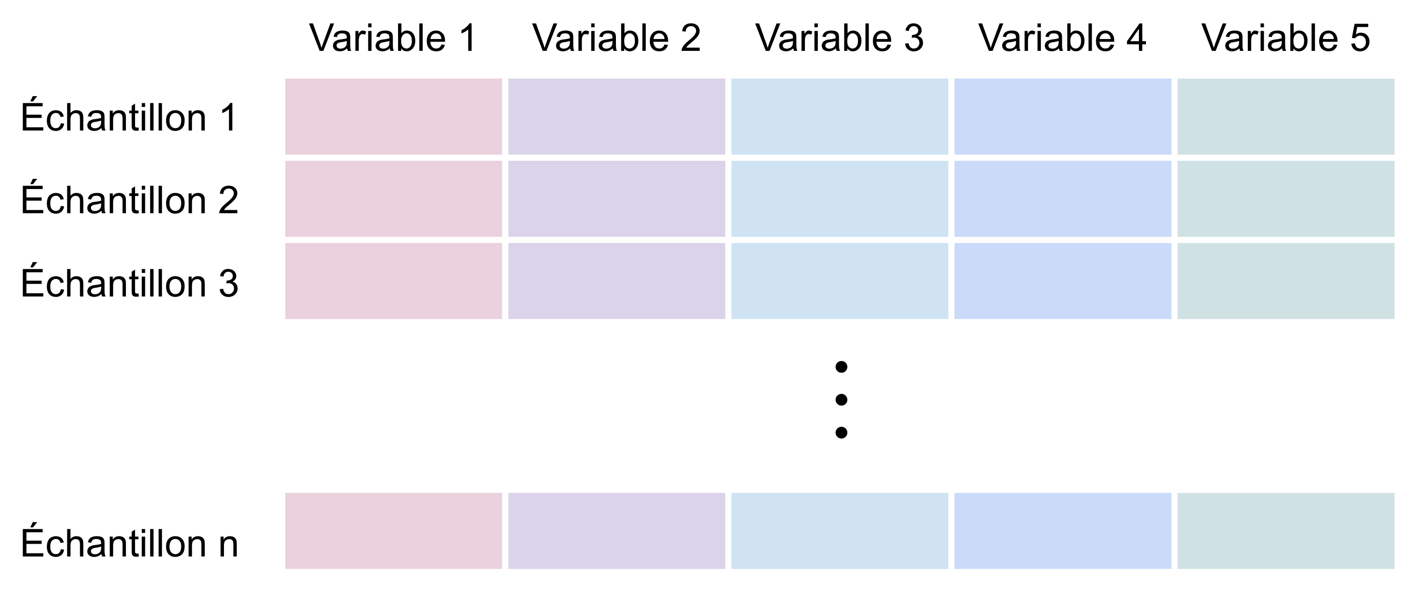En général, un algorithme de machine learning classique prend en entrée une matrice à deux dimensions : les lignes représentent les échantillons (samples) et les colonnes sont les variables (features) décrivant chaque échantillon.