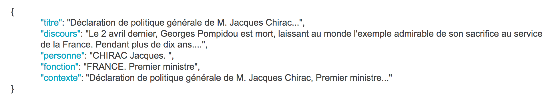 Le format de sortie de ce script est une liste de discours au format JSON, avec des informations contextuelles : titre, orateur, fonction et contexte. On obtient au final 784 millions de caractères, qui représentent 800 Mo de texte. Nous n’avons pas besoin de tant de texte pour apprendre à générer des discours politiques. Nous en extrayons donc un échantillon, en se restreignant d’abord aux discours de candidats dans le cadre d’élections, puis en sélectionnant 1,5 millions de caractères.