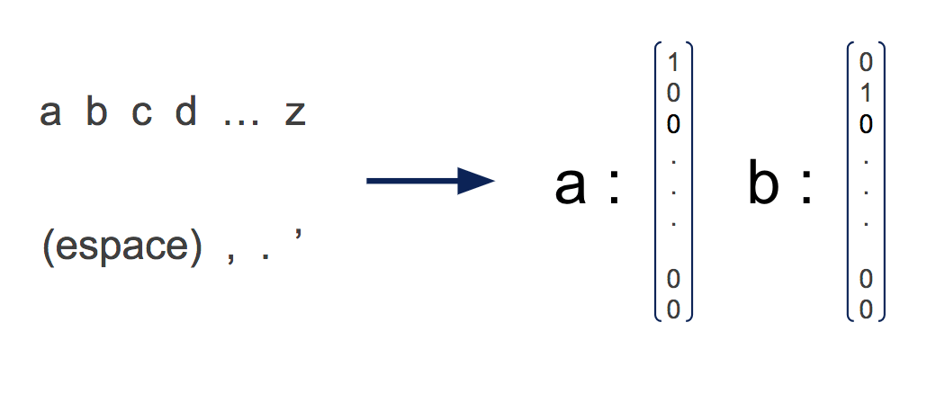 Une fois les séquences de caractères découpées, il faut les encoder dans des vecteurs numériques. On utilise pour cela l’encodage one-hot, où chaque caractère est représenté par un vecteur valant 1 sur une des composantes, et 0 sur les autres. C’est pour cela que la taille de l’alphabet correspond à la troisième dimension de notre matrice “nombre de variables”.