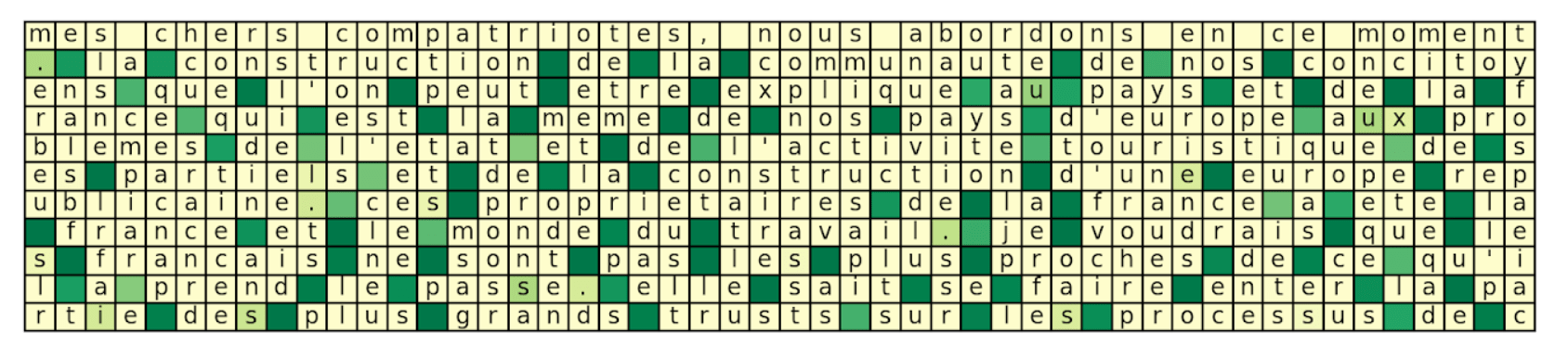 Dans le premier exemple très simple, on suit l’activation d’un neurone de la couche finale (sortie). On devine facilement que ce neurone correspond à l’encodage one-hot du caractère espace. Lorsqu’il est activé à plein (vert foncé), on génère en effet un espace. Il est également notable que ce neurone est parfois activé lorsque “espace” aurait été un caractère correct à générer.