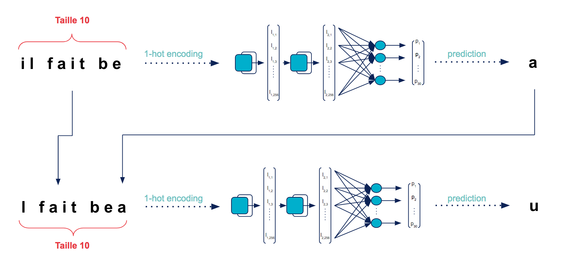 Le schéma ci-dessus illustre ce processus de génération de texte, à partir d’une séquence de taille 10 par souci de clarté. En réalité, notre modèle étant entraîné sur des séquences de longueur 50, il faut respecter cette contrainte et lui donner une phrase de départ de taille 50.