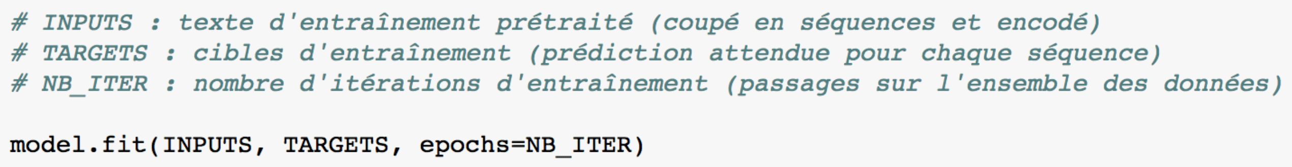 Notre objectif est de prédire, à partir d’une séquence de 50 caractères consécutifs, le caractère suivant. Il s’agit d’un problème d’apprentissage supervisé : à chaque itération, on fournit au modèle une séquence d’entrée encodée ainsi que le caractère encodé attendu en sortie. Le modèle effectue une prédiction, la compare à la cible attendue, et ajuste ses paramètres (aussi appelés poids du réseau) en cas d’erreur. Nous avons préparé nos données et créé notre modèle, il ne reste maintenant plus qu’à lancer l’apprentissage. Une ligne suffit pour démarrer cette étape.