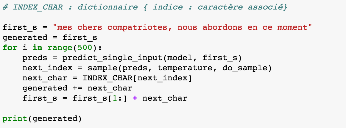 C’est très simple ! Il suffit de donner au modèle une phrase de départ de la bonne taille et de lui demander de prédire un caractère. Ce caractère prédit est ensuite concaténé à la phrase initiale et la première lettre de celle-ci est supprimée. On se retrouve alors avec une nouvelle séquence de la même taille que la première, avec laquelle on peut à nouveau alimenter le modèle. En itérant autant de fois que nécessaire, on obtient finalement un texte de la longueur voulue.