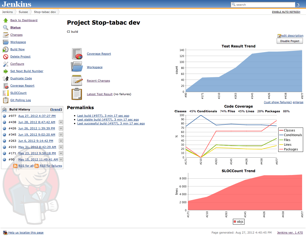 Pour vous mettre l'eau à la bouche, voilà le dashboard Jenkins obtenu à la fin d'un projet ayant duré 6 semaines :