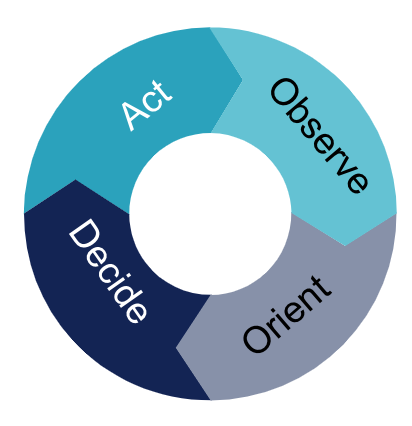 C'est une boucle qui répond au nom de OODA pour "Observe, Orient, Decide and Act". dont une représentation simpliste serait la suivante (dans le modèle original, chacun des éléments Orient, Decide and Act nourrissent l'Observation).