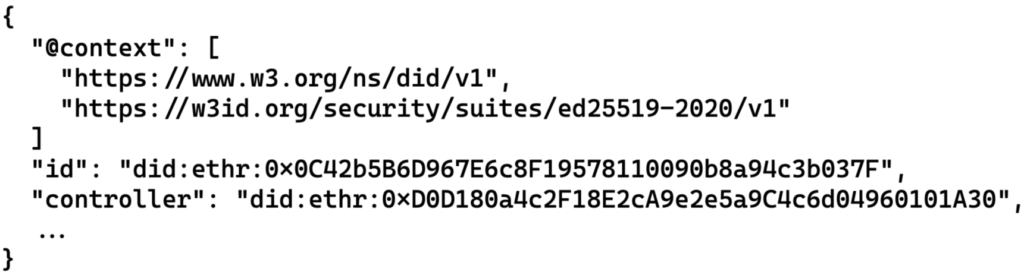 • “controller” : fait référence au DID de l’agent. Quand ce champ est absent, le DID spécifié dans le champ “id” prend le contrôle. Ce champ peut également prendre la forme d’un tableau spécifiant tous les DID ayant le contrôle du document. Si le DID spécifié dans “id” est absent de ce champ, alors ce DID ne peut contrôler le document.