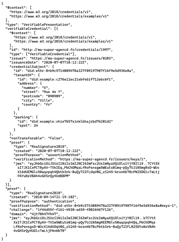 En étudiant cette VP, nous remarquons que le contenu entier de la VC précédente est stocké au sein d’un tableau pouvant contenir plusieurs VC. Ainsi, une VP peut contenir plusieurs VC. La partie “proof” située en bas de la VP est cette fois signée par le détenteur de cette VC, son sujet. La clé permettant de vérifier la validité de cette VP est la clé publique “keys-1” située dans le DID Document du signataire.