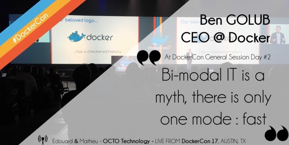 C’est un mouvement de fond qu’opère Docker avec la volonté de se tourner vers les applications traditionnelles, et ceci avec plusieurs annonces. Cette tendance est expliquée par Ben GOLUB, CEO de Docker, pour qui le bi-modal IT est un non-sens : toutes les applications doivent avoir des cycles de vie courts.