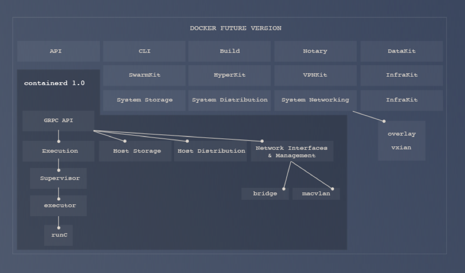 Avec l’annonce du projet Moby, Docker offre un framework pour construire et assembler sa propre plateforme de container : moteur de conteneurisation, système de logging, networking, orchestration. Il devient ainsi possible de remplacer chacun des composants de l’architecture de référence par celui de son choix :