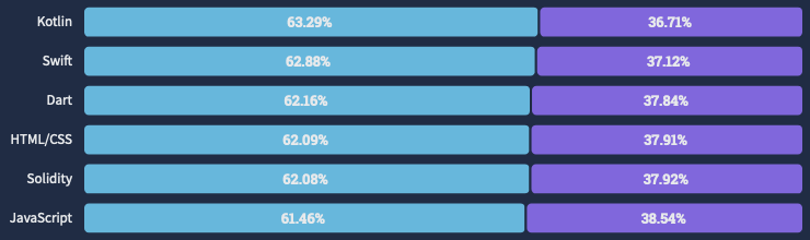 Taux de satisfaction en bleu, d'insatisfaction en violet. Dart fait jeu égal avec Kotlin et Swift, deux langages relativement récents. Il se permet même de dépasser Javascript d’un poil (source : survey stackoverflow 2022)