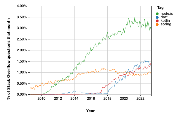 Depuis Q2 2020 stackoverflow reçoit plus de questions portant sur Dart que sur Spring, faisant jeu égal avec Kotlin. Aussi, on constate que la courbe de Dart a la même progression que node.js à ses débuts