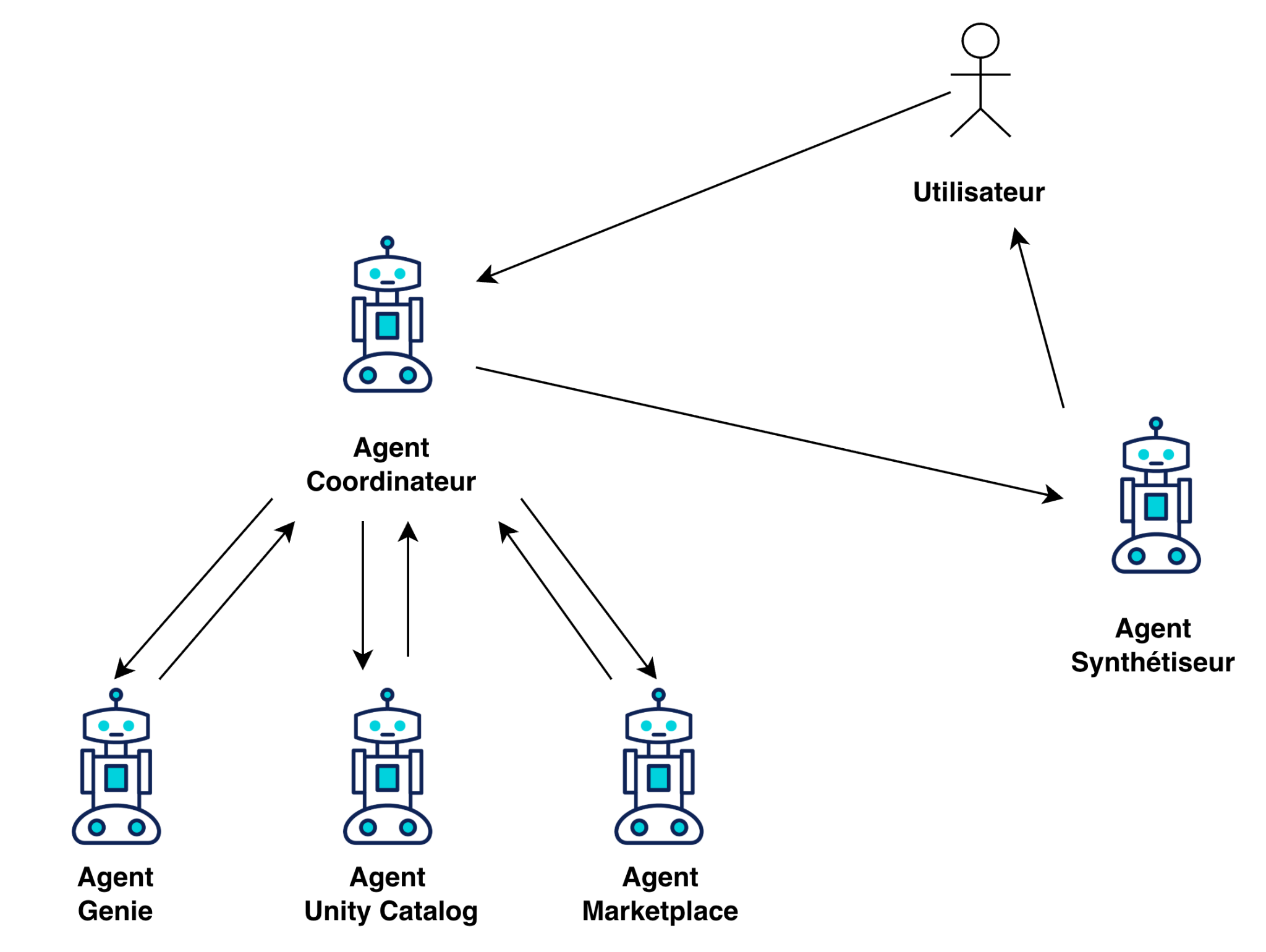 Pour répondre à ce besoin, nous avons conçu un système multi-agents. Il permet de guider l’utilisateur depuis son intention métier jusqu’à l’exécution d’une requête sur le bon dataset, en quelques secondes.