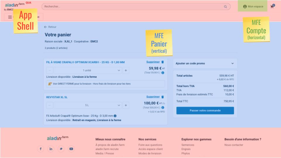 Afin d’avoir le moins de modifications possibles dans ce pipeline, chacun des micro-frontends sont buildés en même temps. Puis ils sont déplacés dans l’artefact de build du monolithe, devenu app-shell. Après quelques manipulations sur le routage, ces micro-frontends sont disponible à l’url aladin.farm/${nom-du-micro-frontend}
