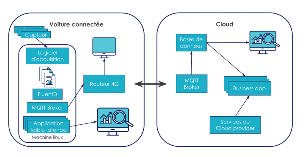 L’architecture technique de la solution est classique, avec un client, un serveur, et une connectivité limitée entre les 2. La voiture est équipée d’un ordinateur de bord tournant sous Linux. Un logiciel d’acquisition permet de collecter les informations mesurées par différents capteurs disséminés dans la voiture et sur le conducteur (caméra, thermomètre, bracelet connecté…). Les fichiers émis par ce logiciel sont ensuite parsés et les informations qu’ils contiennent sont poussées dans une file MQTT.
