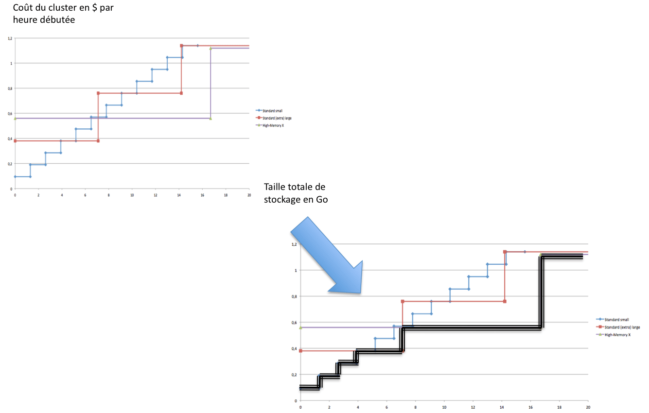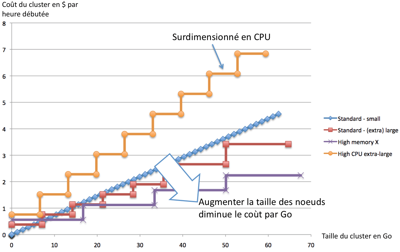 Jusqu’à un besoin de 3,9 Go de mémoire, 3 nœuds « SMALL » font le job. Au delà, il est préférable de passer à des instances LARGE compte tenu du surcoût en RAM généré par les instances SMALL. Enfin, pour des besoins supérieurs à 7,1 Go, il semble plus pertinent d’utiliser des nœuds de la catégorie HIGH-MEMORY plutôt que de doubler le nombre de nœuds STANDARD-LARGE.