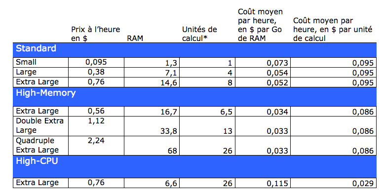 *Pour information, Amazon indique qu’une unite de calcul est équivalente à un Opteron ou un Xeon de 1.0 à 1.2 GHz en 2007.