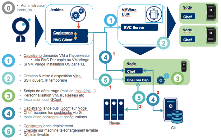 On voit ici qu'on va tout tester : les scripts de création de machine virtuelles, l'installation d'OS automatisée, la configuration des OS via l'outil de GConf (Gestion de configuration), les scripts de déploiements, puis finalement l'applicatif.