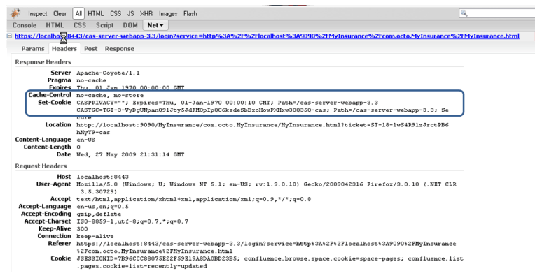 Etape #3 : Dans la mesure où l’authentification a réussie, l’utilisateur est redirigé – via le navigateur - vers l’url initialement demandée. L’url initialement demandée est enrichie d’un attribut nommé ticket. Un exemple d’url serait : http://localhost:9090/MyInsurance/com.octo.MyInsurance/MyInsurance.html?ticket=ST-1-xd342ehPMiyVLhQjfxYo-cas