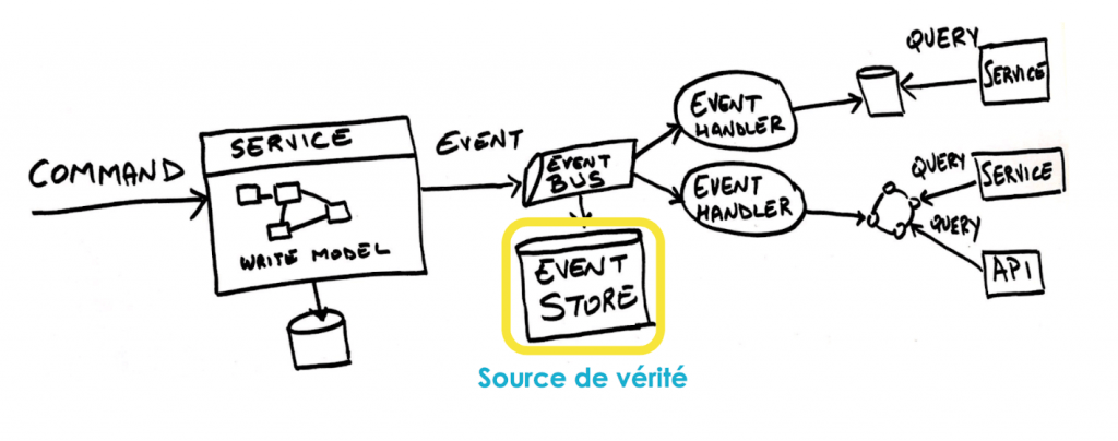 Dans une architecture event-sourcing on ne fait que sauvegarder les événements dans un event-store qui devient la seule source de vérité.