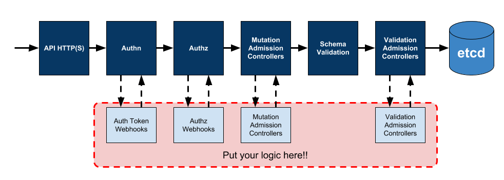 Voyons à présent les dérivations qu’il est possible de venir placer dans le traitement standard d’une requête à destination de l’API server. Dans tous les cas de Webhook, l’API server est configuré pour envoyer à une application tierce - codée par votre soin ou trouvée parmi celles disponibles sur Internet, déployée statiquement ou sous forme de pods - une requête et attend en retour des informations complémentaires qui vont pouvoir poursuivre le traitement de la demande client.