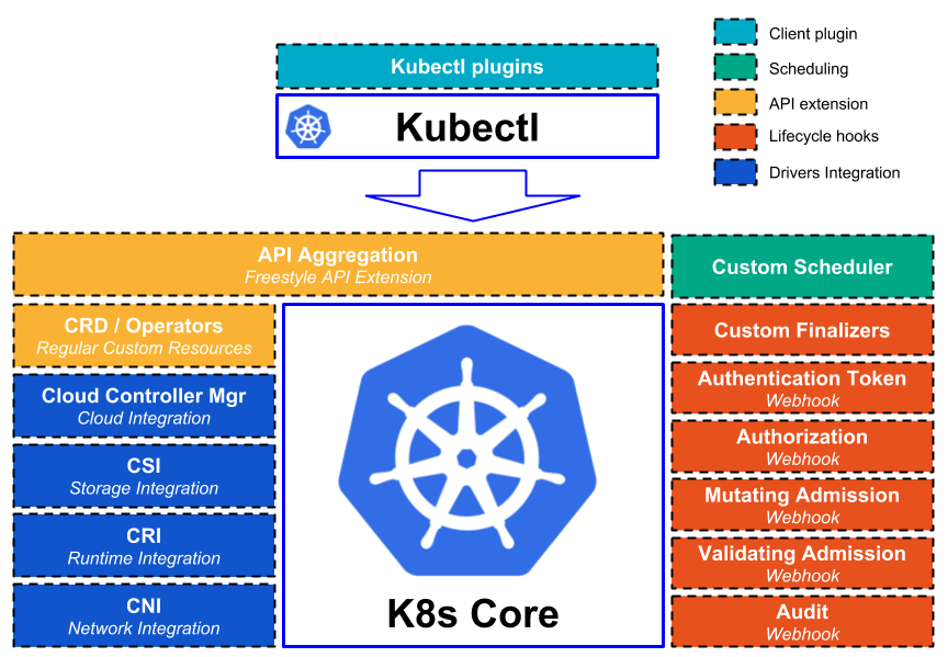 Dans cet article, nous allons découvrir quelques types de plugins permettant d’étendre Kubernetes. La volonté de ces extensions est de permettre à des tiers de contribuer à des fonctions de Kubernetes sans impacter son cœur. L’objectif de la communauté Kubernetes à présent est avant tout à se stabiliser au travers d’une cure d’amaigrissement et de modularisation. Tout ce qui relève d’une implémentation spécifique se voit progressivement remplacé par une interface permettant de brancher différentes implémentations out-of-tree, c’est à dire en dehors du code source de Kubernetes.