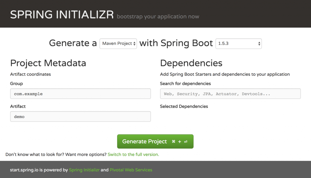 Après avoir choisi vos dépendances sur ce site, cliquez sur "Generate Project", qui vous donnera un zip avec votre projet initialisé. Lancez votre application avec mvn spring-boot:run, et hop, un serveur qui fonctionne.