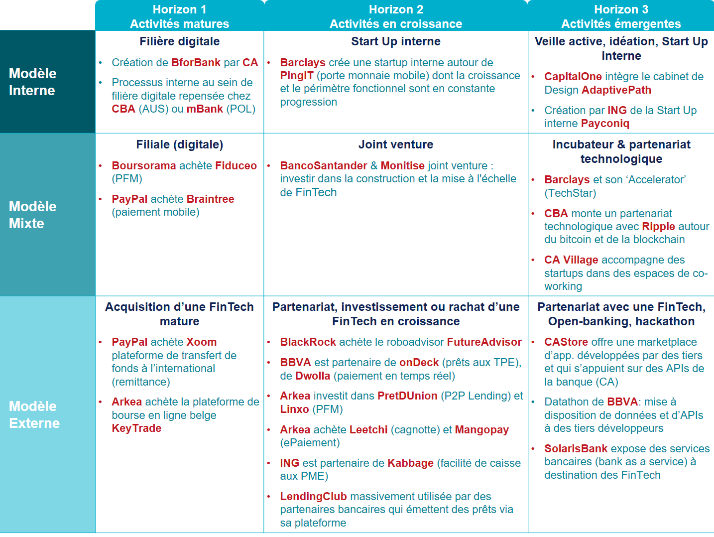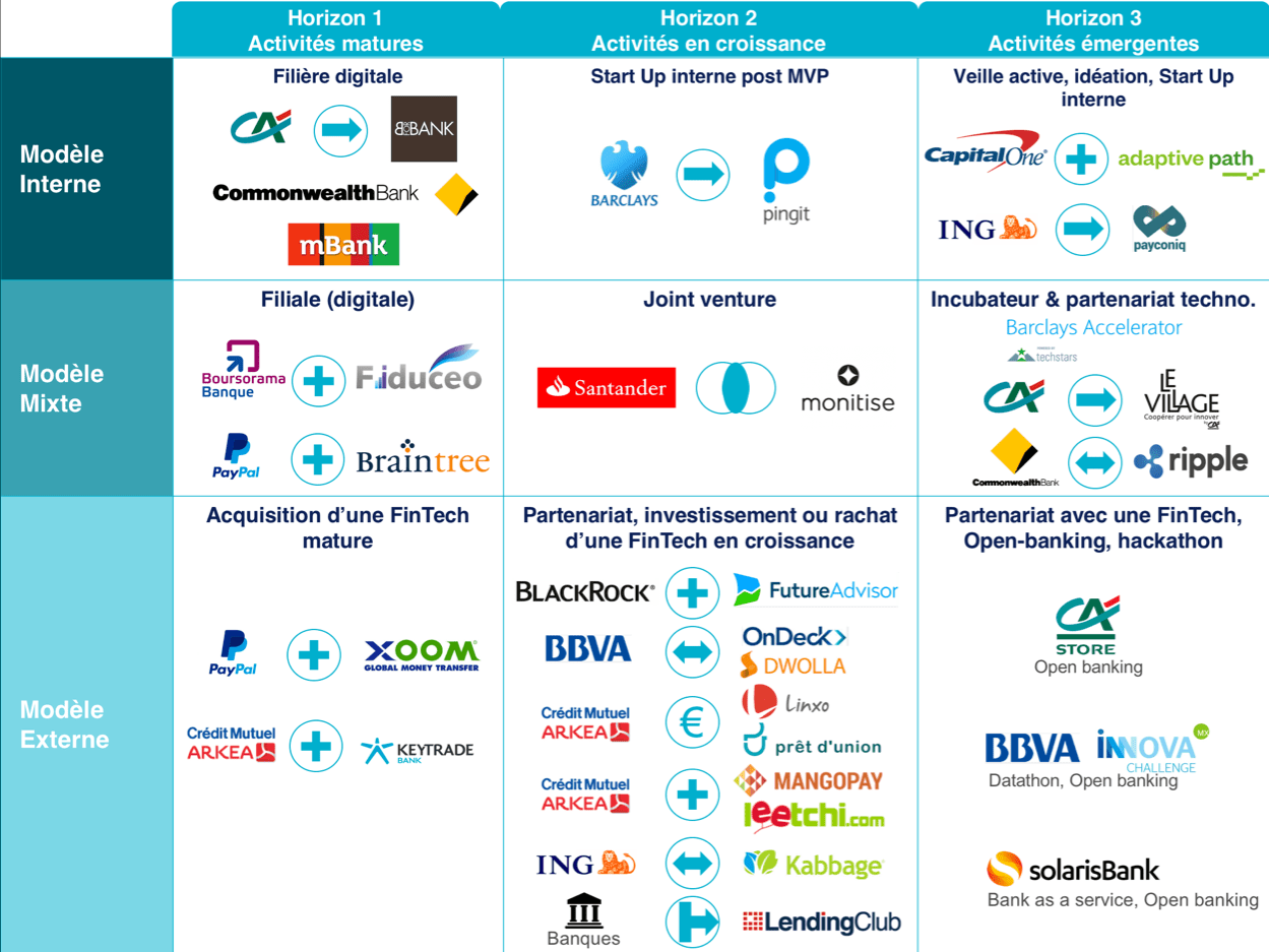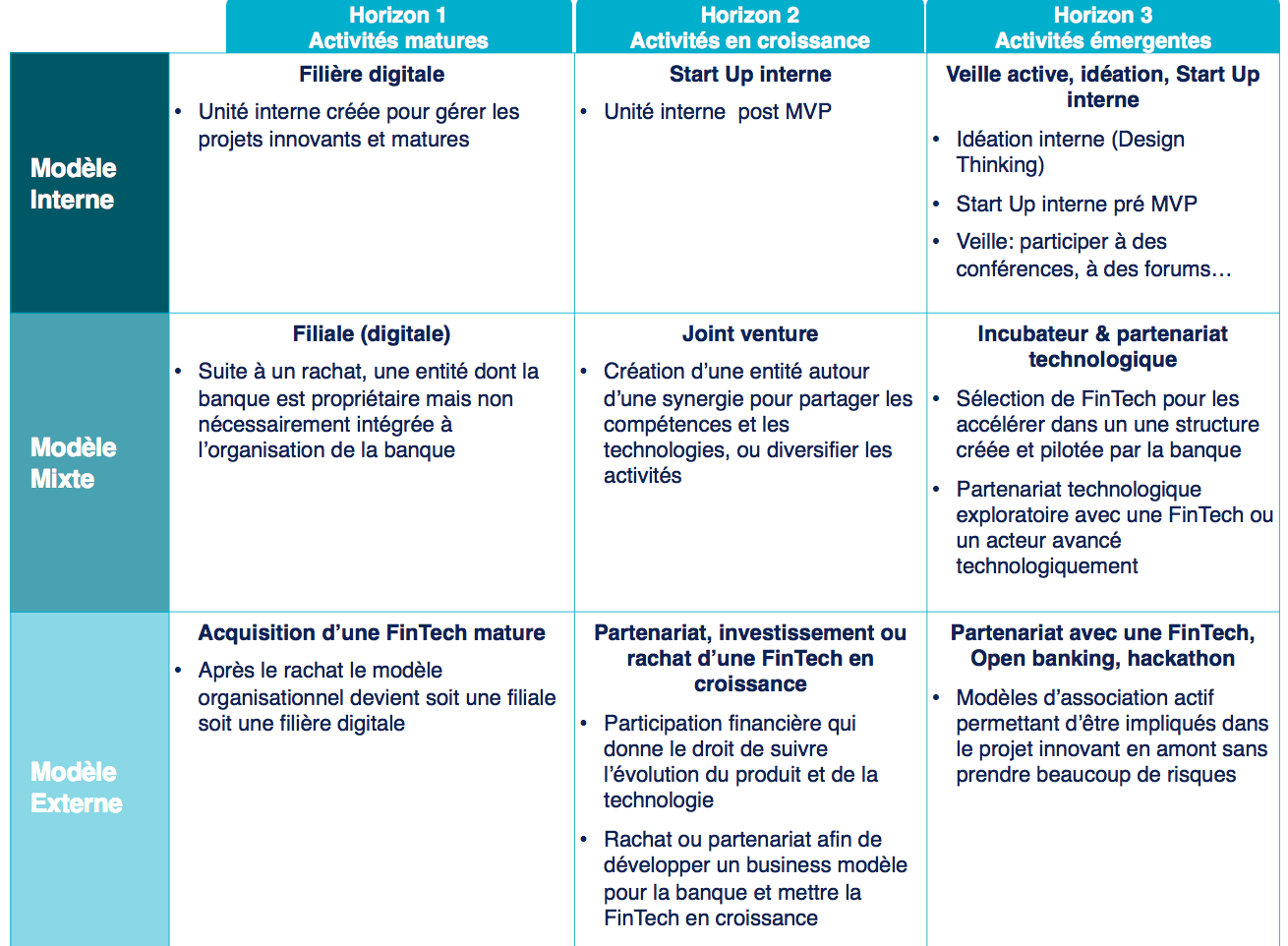 Le centre de gravité actuel se trouve à l'intersection de l'horizon 2 et du modèle externe. C'est à dire que l'innovation bancaire est portée essentiellement par les FinTechs auprès desquelles les banques se rapprochent d'une manière ou d'une autre (modèle d'externalisation de son innovation). Les nouveaux modèles d'activité sont en croissance et ne portent pas encore aujourd'hui une activité suffisamment rentable (volume, marge, ...) et qu'il faut les faire passer à l'échelle ("scaler") pour être véritablement en succès.