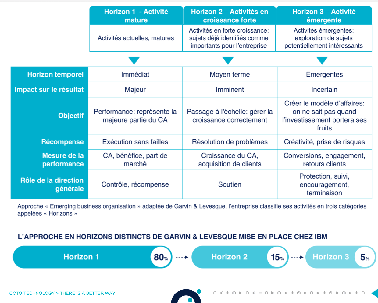 Nous préconisons une approche « Emerging business organisation » adaptée de Garvin & Levesque, qui permet à l’entreprise d’organiser ses activités en trois catégories appelées « Horizons » :
