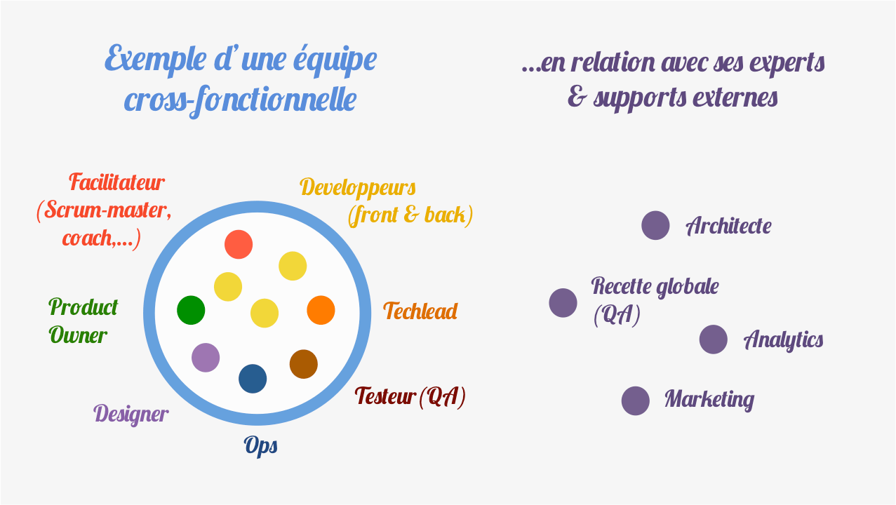 Voici une représentation possible d'une équipe cross-fonctionnelle agile et des intervenants avec lesquels elle interagit de manière privilégiée :