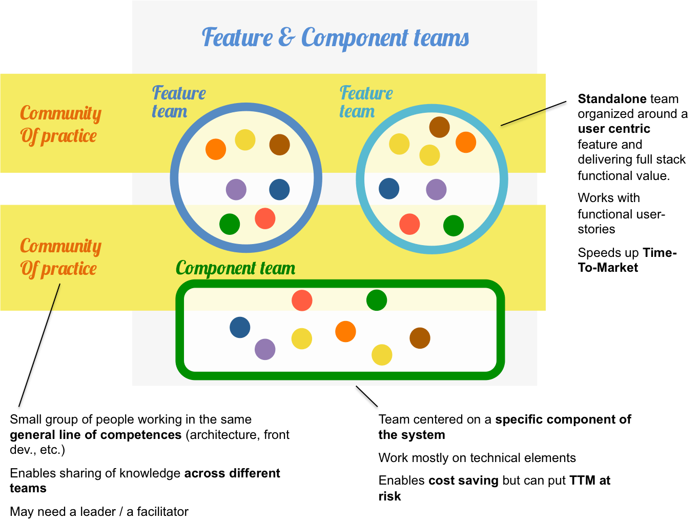 To limit these issues as well as the global TTM of an organization, one should keep the number of Component teams lower than the number of Feature teams. We believe the proper proportions to be Feature team [70-80%] vs Component team [20-30%].