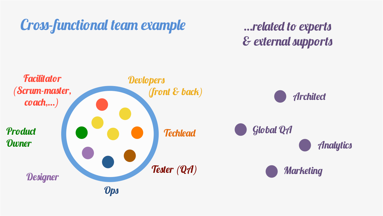 A cross-functional team is a team gathering all necessary skills, from concept to production, to achieve the product. The SCRUM methodology, among others, promotes this model. In such a team, there is no more silo: everyone works together and is collocated to enable an optimal communication. For the same reasons, a small sized team is preferred: 6 to 12 people per team (pizza-team).