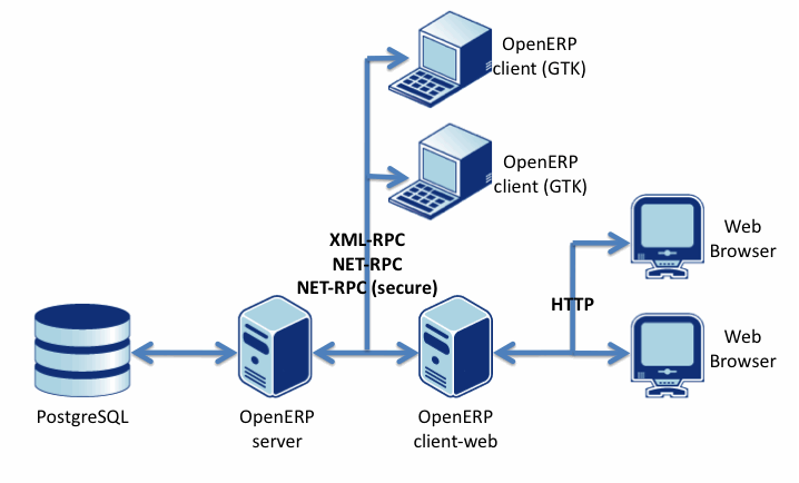 OpenERP is based on client /server in disconnected mode. Like any other ERP, it is mainly a data base - PostgreSQL - on which is added an application server called OpenERP server. This server supports the following protocols : Net-RPC et XML-RPC secured or not.