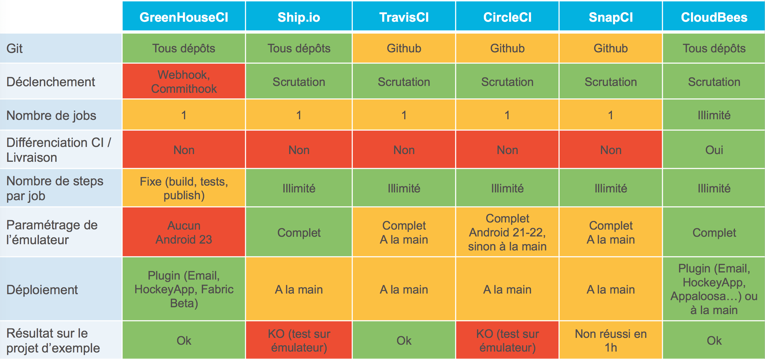 Sur le tableau suivant, la ligne "Git" indique si la plateforme sait consommer n'importe quel dépôt git accessible par HTTPS ou SSH (avec clef publique), ou si elle est limitée à Github. "Nombre de jobs" indique le nombre de jobs différents qu'il est possible de définir puis de lancer séparément sur la plateforme. "Différenciation CI / Livraison" indique s'il est possible, ou non, de différencier les jobs d'intégration continue de jobs permettant d'aller jusqu'à la livraison d'une nouvelle version. "Paramétrage de l'émulateur" : versions de l'émulateur disponible, à la main signifie que l'émulateur doit être configuré avec du code plutôt qu'une interface web. "Déploiement" indique les plugins disponibles depuis une interface web pour déployer l'application, "A la main" signifie qu'il est quand même possible de déployer l'apk, mais qu'il faudra le faire par une tâche gradle ou un script shell.