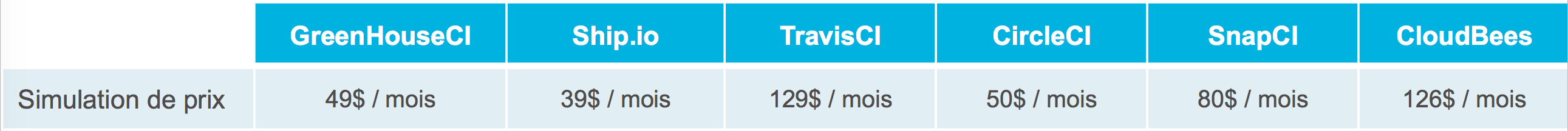 L'ensemble des acteurs excepté CloudBees propose un abonnement fixe par mois, dépendant du nombre d'utilisateurs et du nombre de builds exécutables en parallèle.